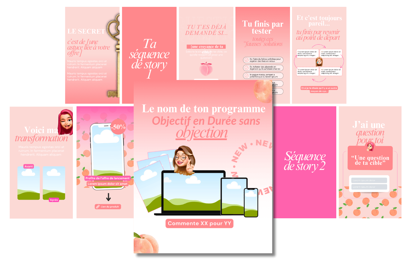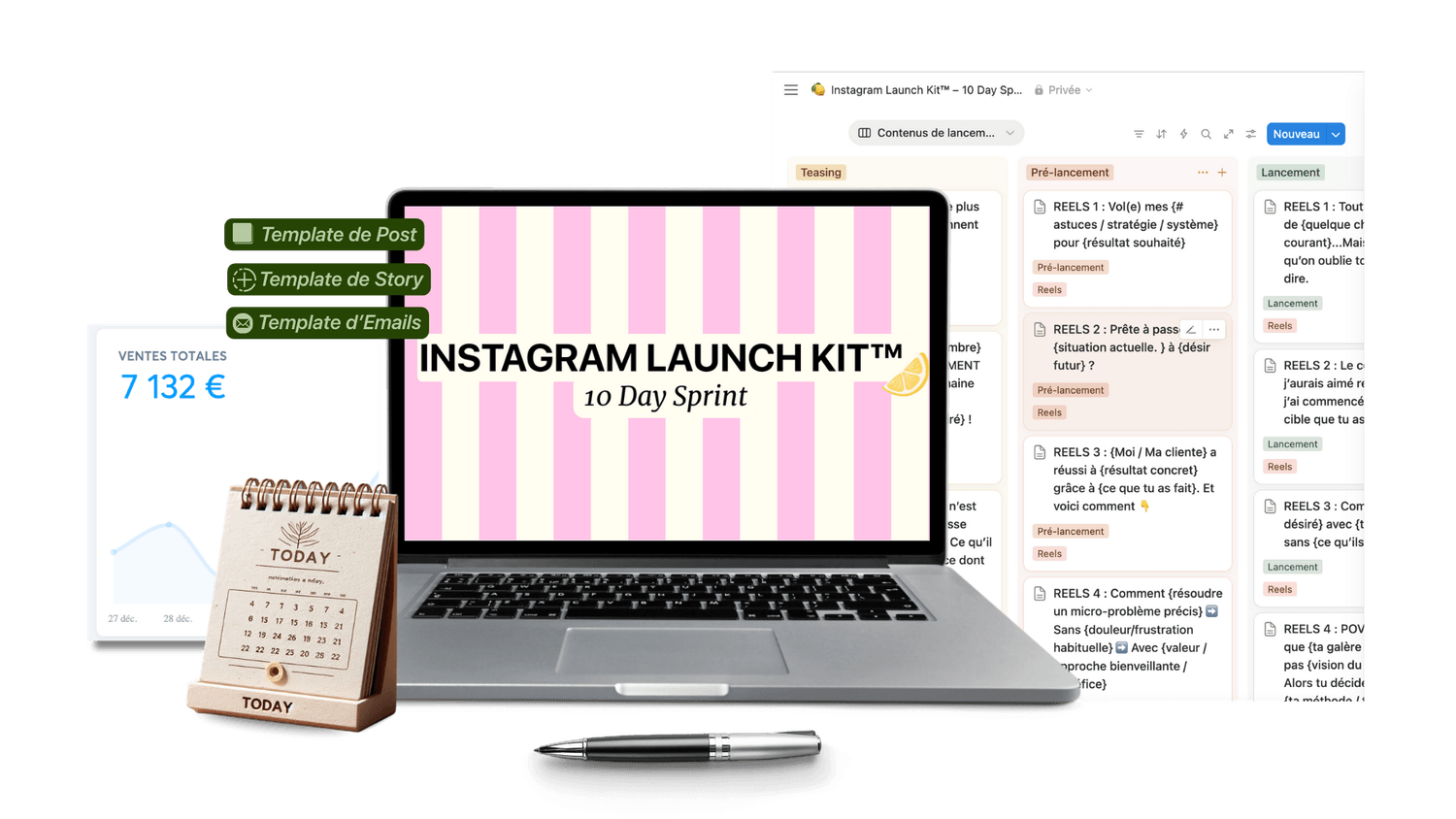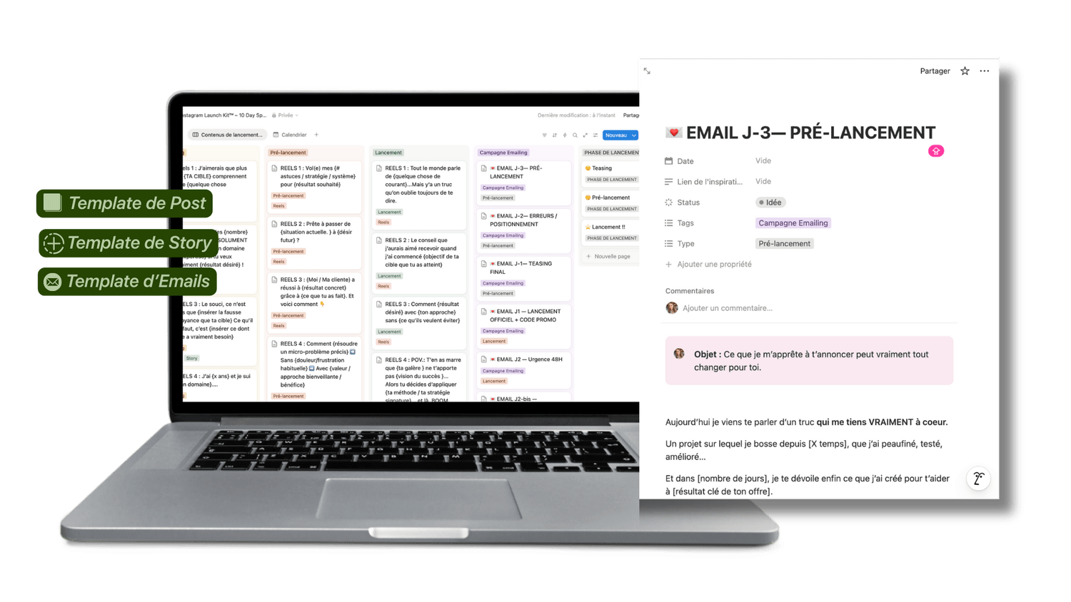 Stories, emails, posts, séquences, post épinglé… Tout est prêt à l’emploi.