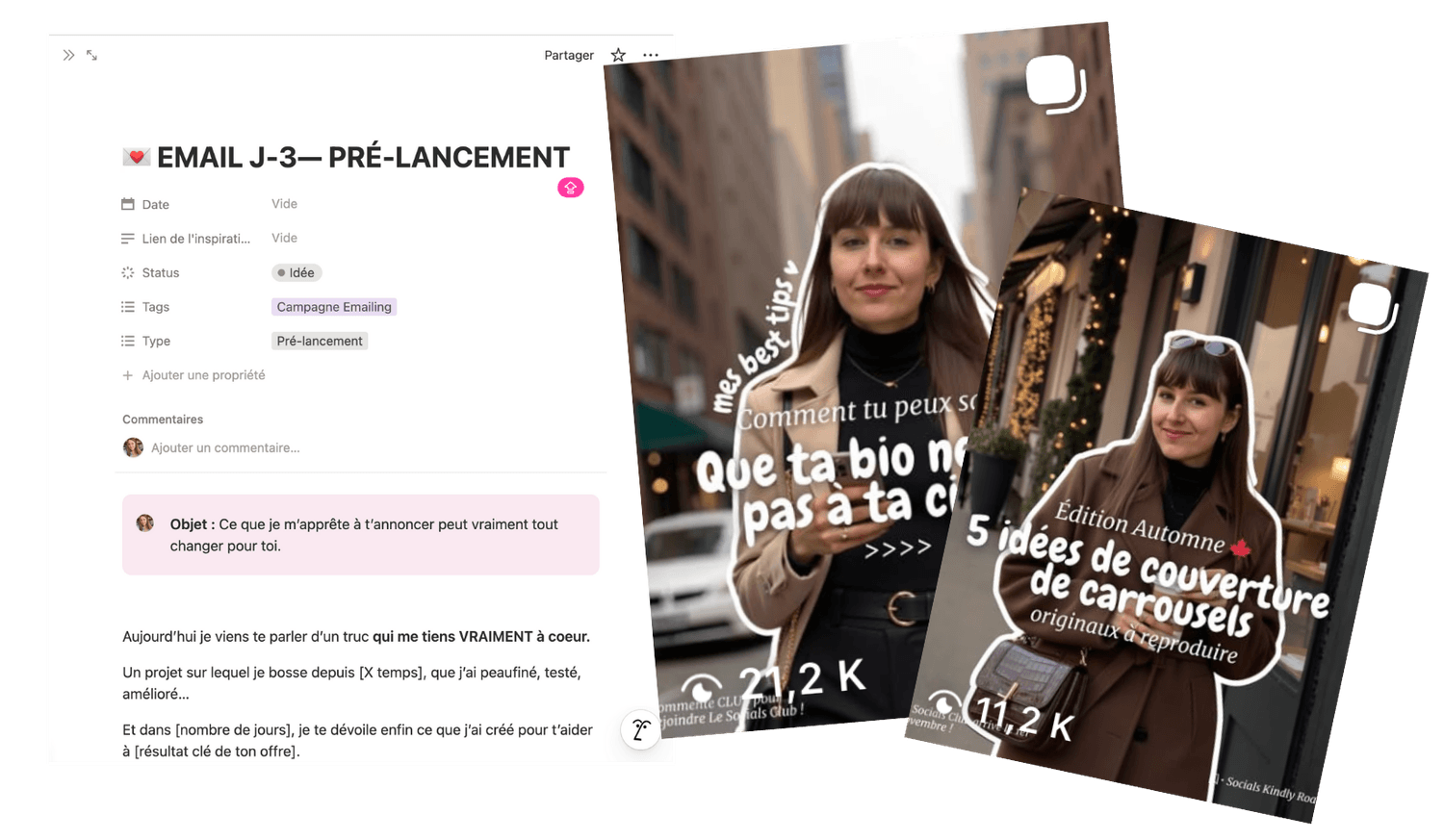 Stories, post épinglé, Reels, emails, TOUT est déjà rédigé