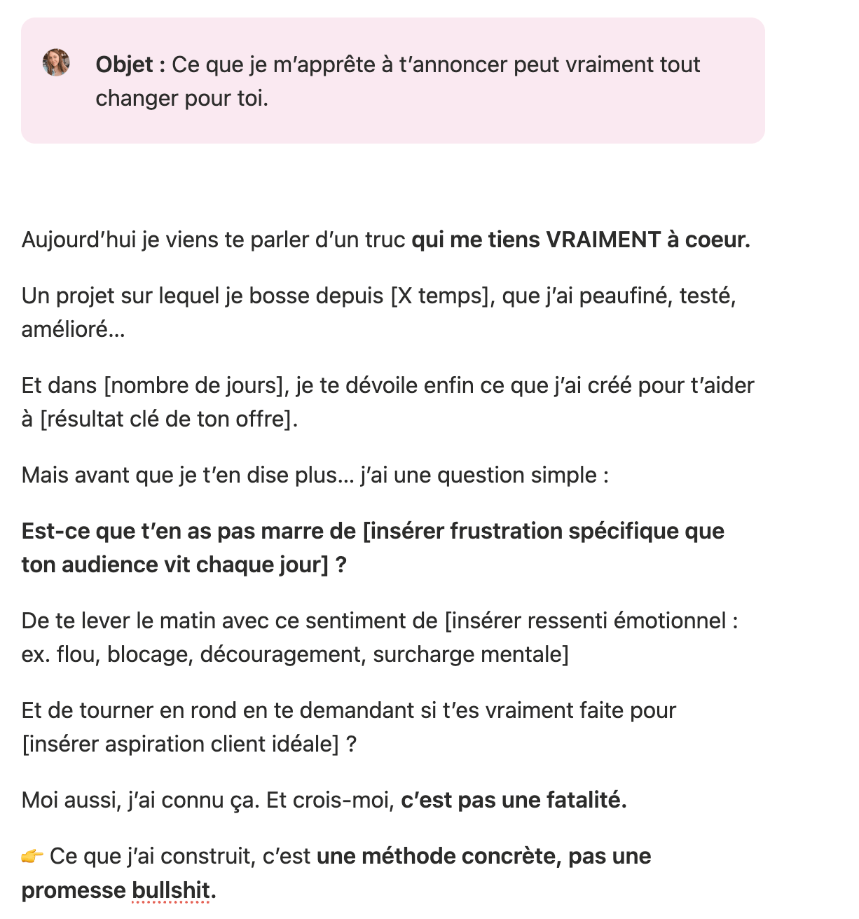👉 Tu adaptes à ton offre et à ta voix, mais tu ne pars jamais d’une page blanche.
