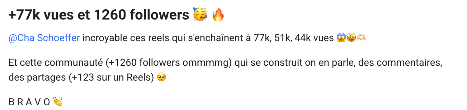 Un challenge mensuel pour rester focus et progresser sur un point précis (ex : poster + de Reels, booster tes vues de story, travailler ton engagement…).